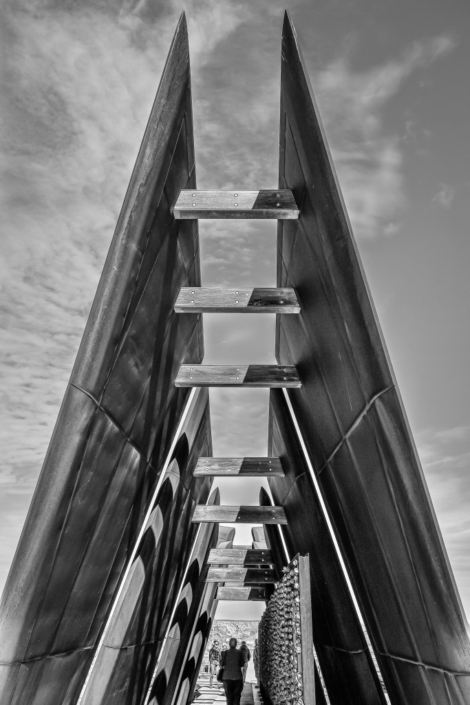 This stunning & iconic architecture standing on top of the mullock heap overlooking Broken Hill left a lump in my throat & its narrow tunnel shape & sloping walls almost made me feel claustrophobic as I walked through it reading the plaques & seeing the rose tributes to over 800 miners who have lost their lives in underground mining accidents there. Converting this image to black & white far better conveys the emotions of my experience, both then & now